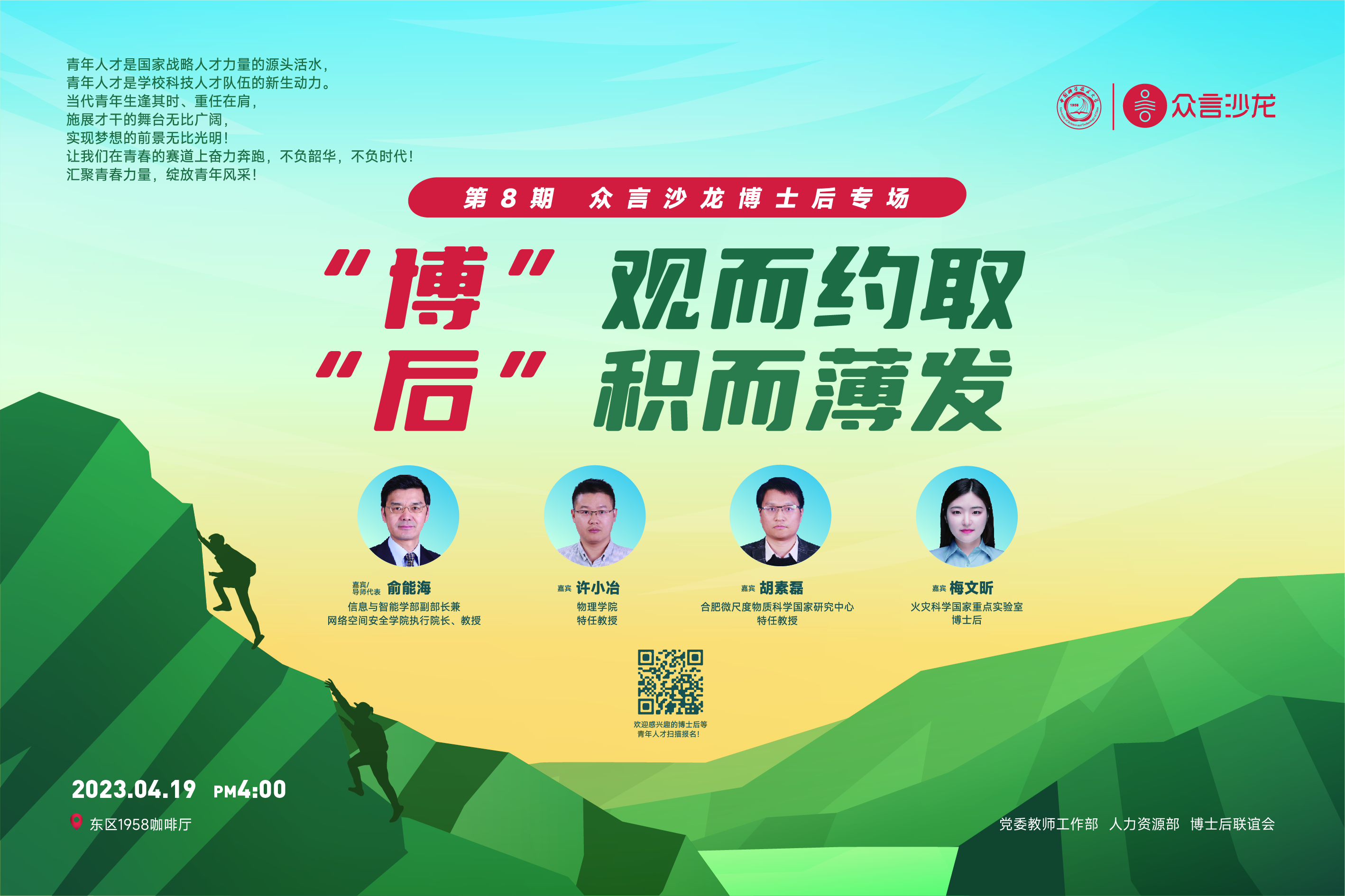 博士后是学校青年科技人才队伍中的生力军,第八期“众言沙龙”活动将以“‘博’观而约取,‘后’积而薄发”为主题,邀请嘉宾与大家面对面交流。活动将于4月19日(周三)下午4:00在东区1958咖啡厅开展,诚挚欢迎感兴趣的博士后等青年人才报名参加!报名链接:https://www.wjx.cn/vm/m7QCzS0.aspx#。报名通过者将另行通知,欲报从速。