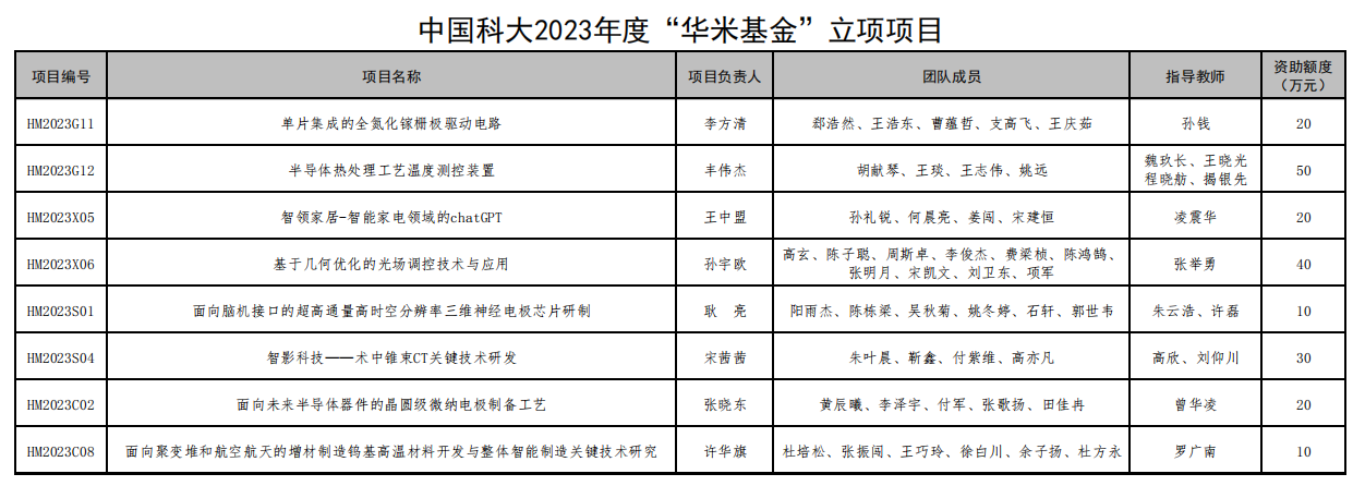 中国科大2023年度“华米创新创业基金”立项项目通知